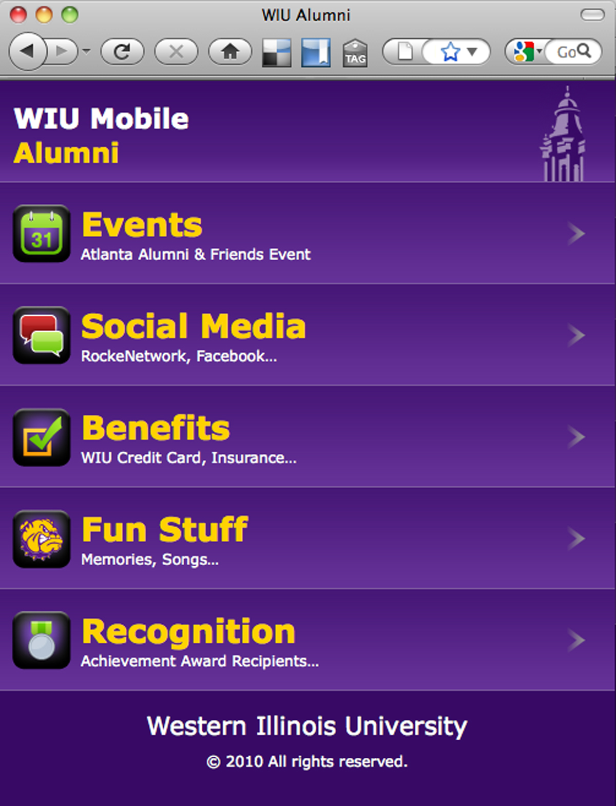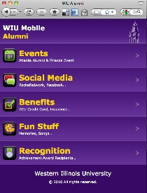 "By developing a new mobile site for Western's alumni and friends, we are providing the information they want quickly, with just the swipe of a finger across their Smartphone, iTouch and/or other mobile devices," said Brad Bainter, vice president for advancement and public services. "It's just one more way to keep in touch with our many alumni and friends. Your phone is your gateway to all that is WIU."