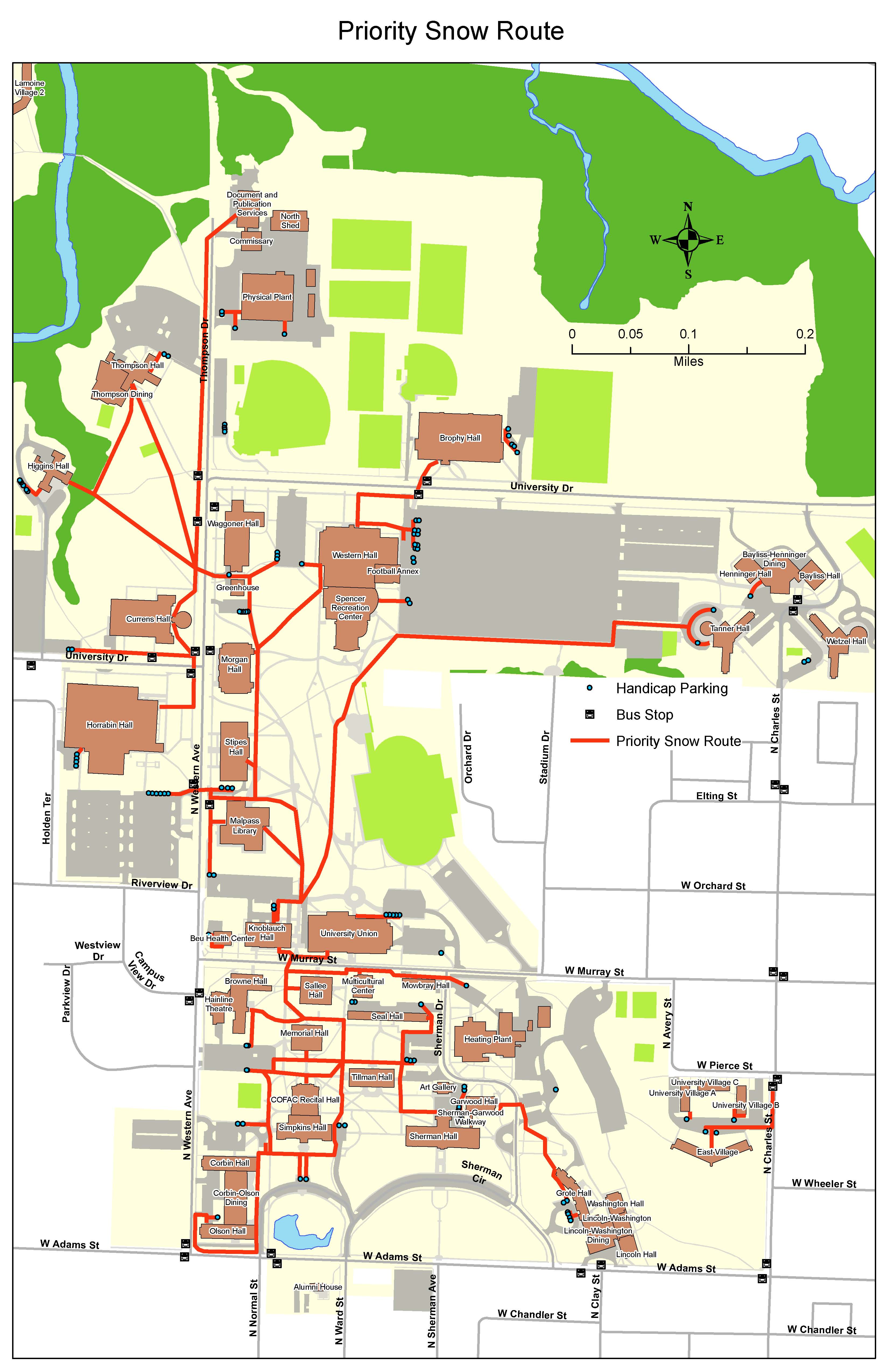 As in previous years, priority snow removal routes to improve accessibility on main campus pathways during inclement weather have been established. While Physical Plant staff will remove ice and snow from all campus walkways, designated areas will be cleared first. Priority routes are listed and a map is available at wiu.edu/vpas/physical_plant/snow_ice.php.