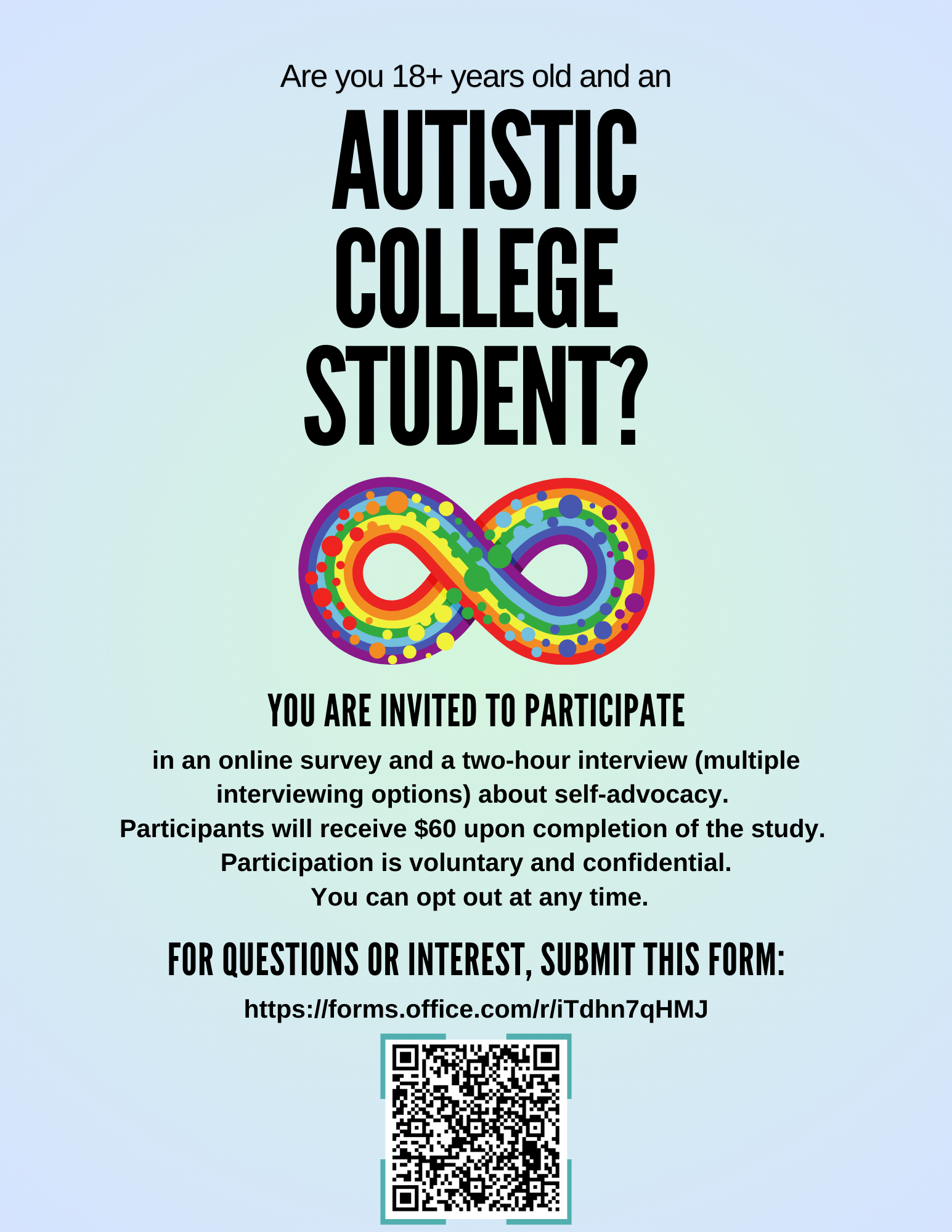 If you are interested in an evaluation of autism for your child, please complete and submit the following intake form (Jotform). Once we receive this form, we will respond within within 5 business days to complete an initial screening to determine next steps in the evaluation process. Please allow for additional time if a request is submitted over a weekend or holiday break. The University (and Clinic) will be closed for the Fall break the week of November 24th and will return calls from the break in December.