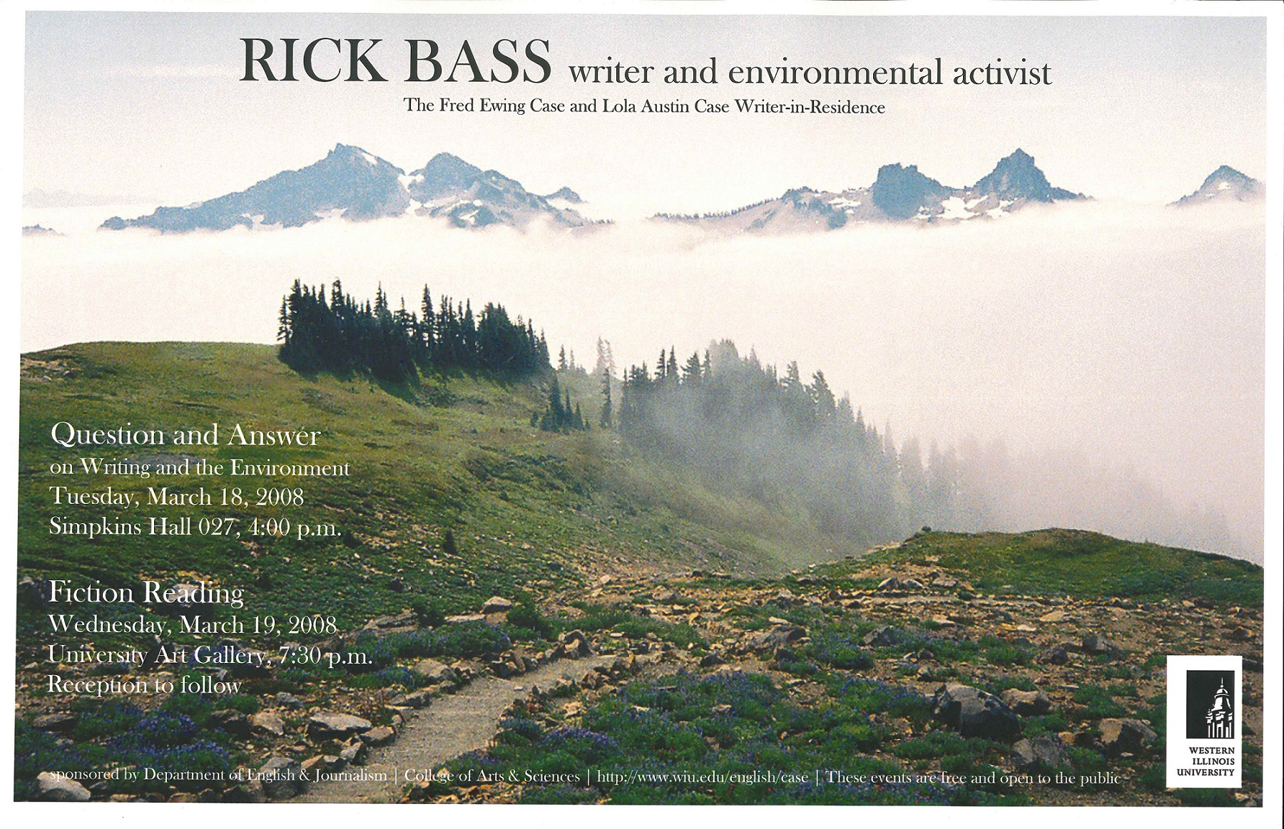 Bass visited WIU the week of March 17. He met with individual students about their writing and visit classes, such as English 340, American Nature Writing. Bass met the public on two occasions: A Question and Answer session on the Craft of Writing and Environmentalism on Tuesday March 18 at 4:00 p.m. in Simpkins, room 27, and a Fiction Reading on Wednesday March 19 at 7:30 p.m. at the WIU University Art Gallery followed by a reception. Both events are free and open to the public. These events are sponsored by the Fred Ewing Case and Lola Austin Case Endowment of the Department of English and Journalism.