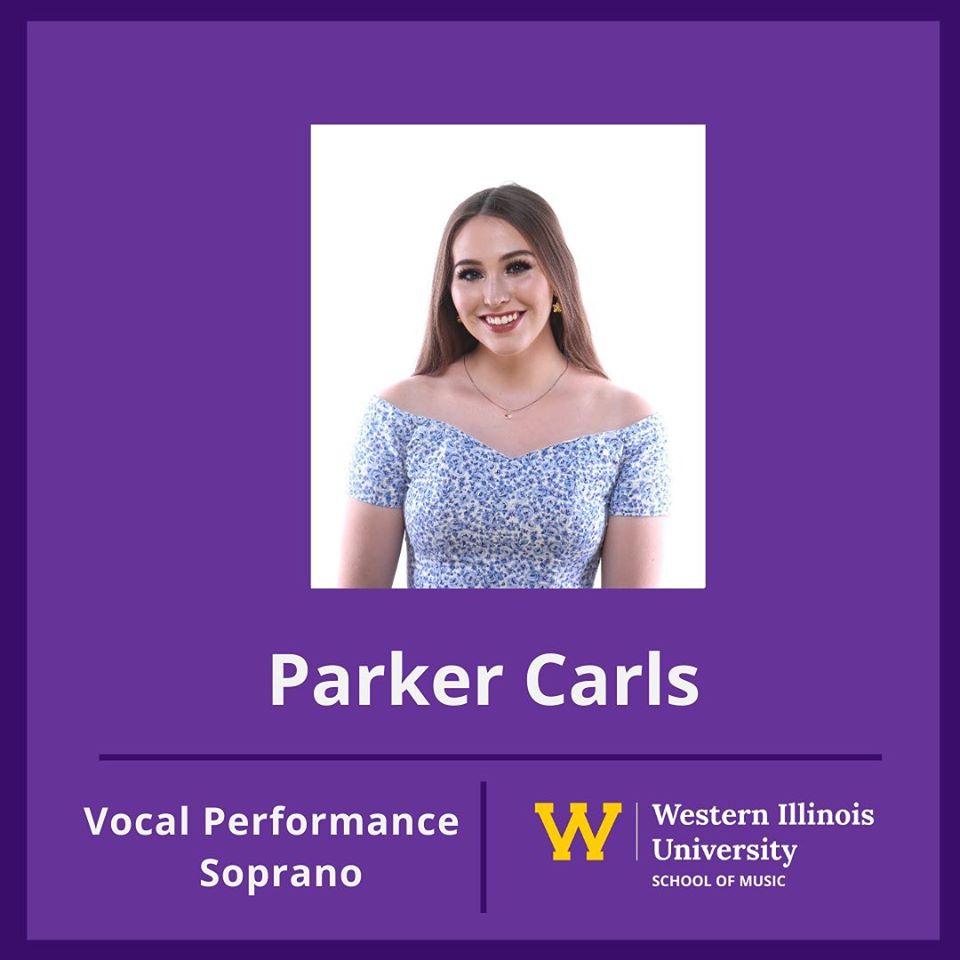 PARKER CARLS (Beardstown, IL), a student of Mr. Terry Chasteen, graduates with a Bachelor of Music in Vocal Performance. She will be attending the University of North Texas College of Music in Denton, TX to pursue a Master of Music in Vocal Performance under professor Jennifer Lane.