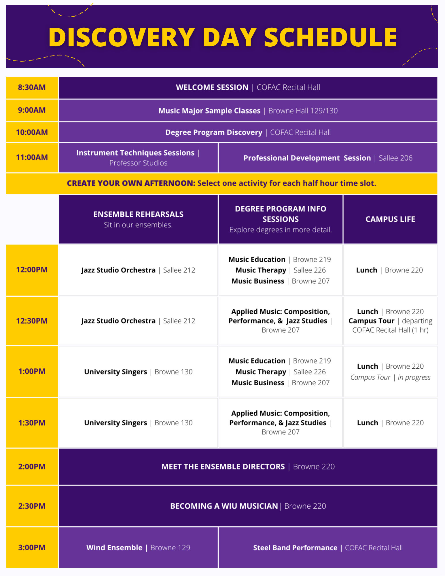 WIU Music Major Discovery Day is an opportunity for current high school or college music students to explore the various degree program options available in the School of Music. Students attend sample classes in areas of interest and experience techniques classes and ensemble observations based on their primary instrument.