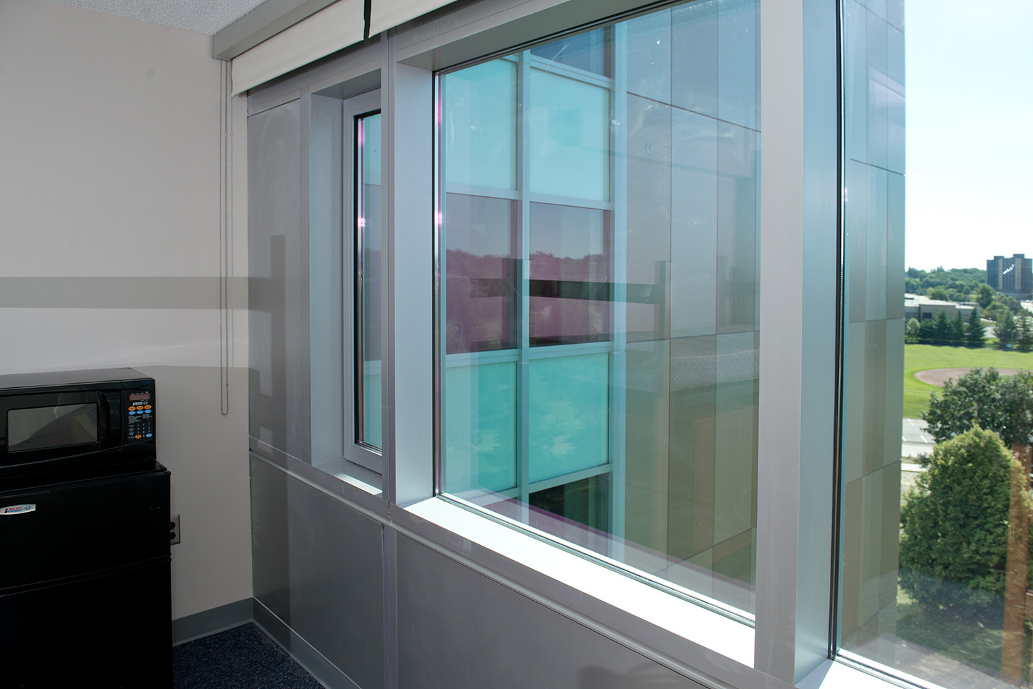 Before the renovations, the building's older metal panels had started to leak air and water into the building. Thompson Hall is now covered with a new, energy-efficient glass and metal façade and the glass walls give students better views of the WIU campus.
