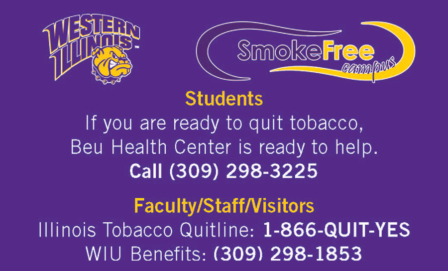 "It is important that our campus community is a healthy environment, which includes the elimination of second-hand smoke," added JoAnn Hairston-Jones, WIU Beu Health Center Health Education Coordinator. "WIU is committed to providing support to students, faculty, staff and visitors who are considering tobacco cessation. Quitting isn't easy, but it can be done."