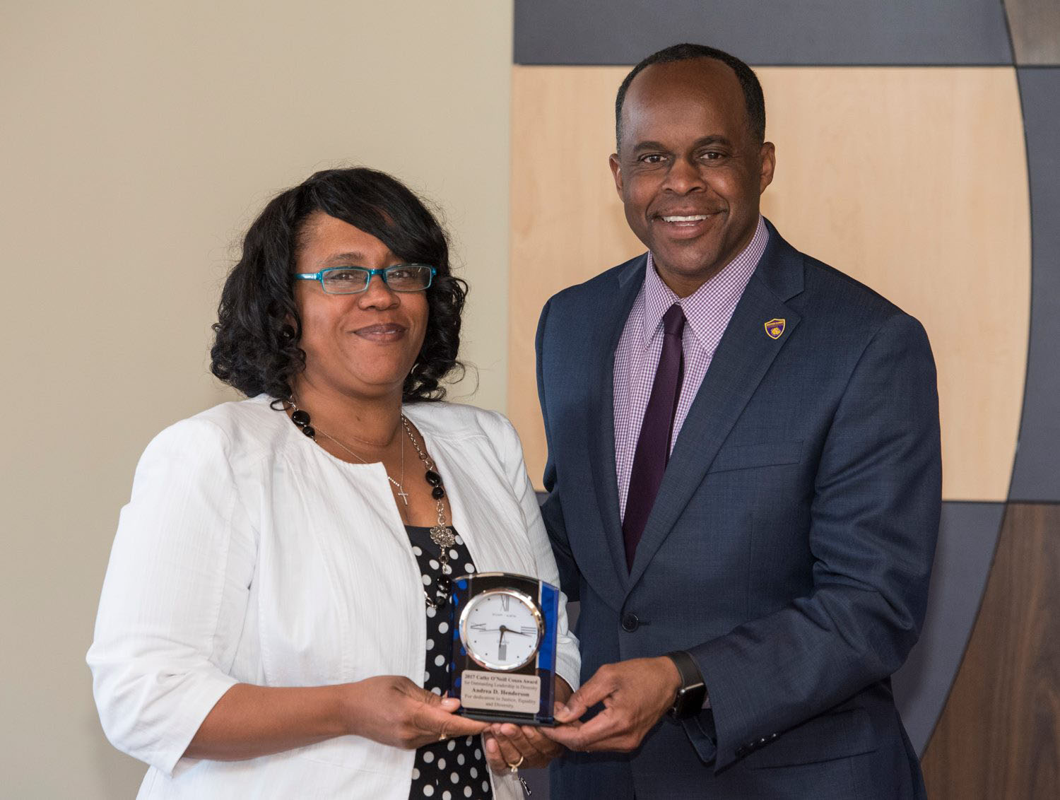 "Andrea works in the background for each and every one of us, patiently teaching, providing advocacy and support for faculty, students, and staff in matters of equity. She has worked relentlessly to provide due process, while assisting university community members through trauma and crisis. She is fearless -- unafraid to come to the table and confront issues of diversity and inclusiveness, with a goal-minded focus," Williams added. "Her commitment does not stop at the edge of our campuses, but shines in the positive work she consistently provides in the community, supporting housing initiatives, our children, and law enforcement. She motivates those who work with her to be more aware and make positive change in the environment we all share. "