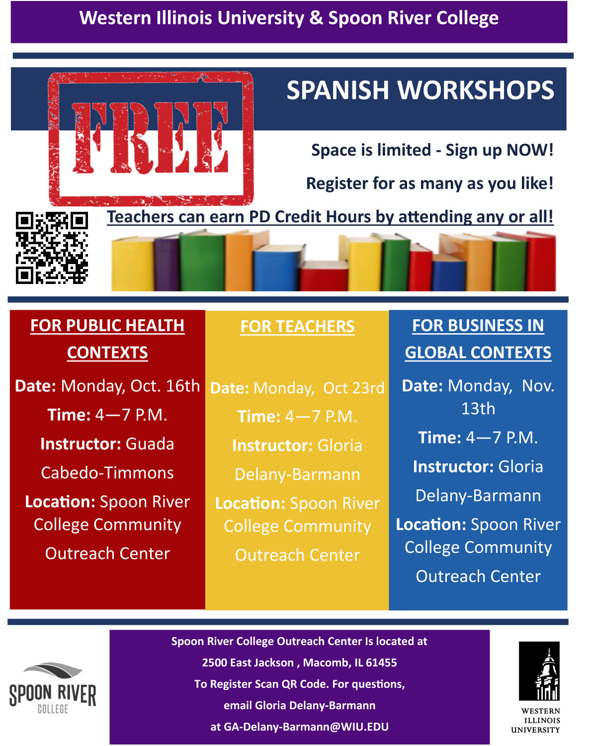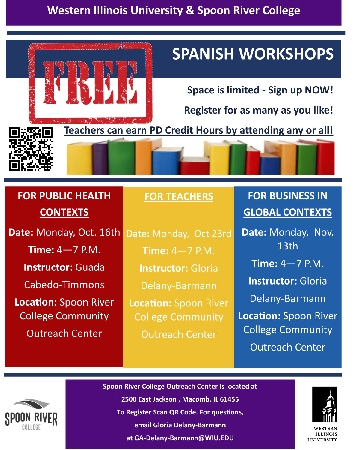 MACOMB, IL -- Western Illinois University and Spoon River College will offer a free short series of Spanish Workshops. The workshops will be at the Spoon River College Outreach Center.