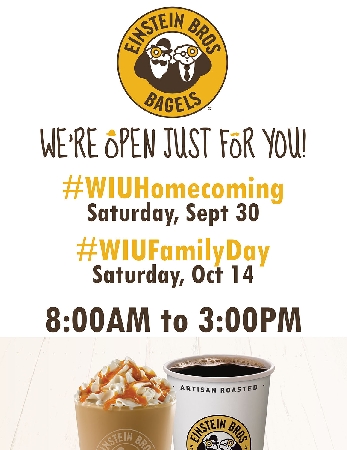 MACOMB, IL -- In celebration of Homecoming 2017 and Family Day at Western Illinois University, Einstein Bros. Bagels will be open special hours in the University Union.