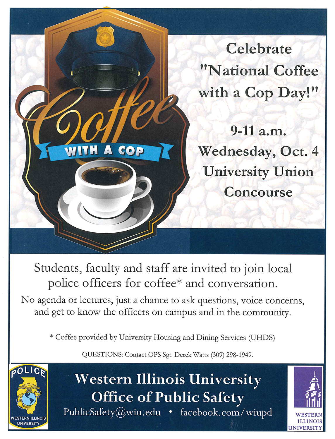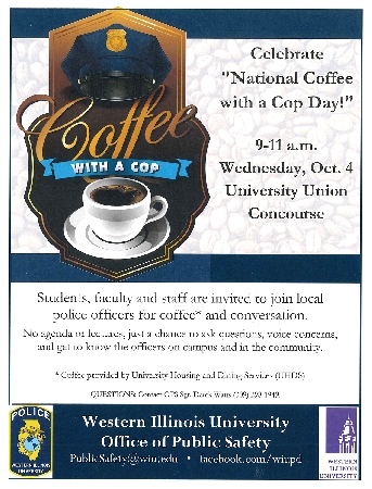 MACOMB, IL – The Western Illinois University Office of Public Safety (OPS) will host "Coffee with a Cop" from 9-11 a.m. Wednesday, Oct. 4 in the University Union Concourse.