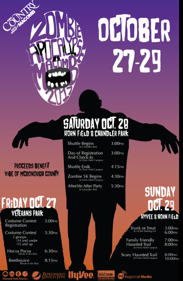 On Saturday, Oct. 28, the Zombie 5K will begin at 4:30 p.m. at Horn Field Campus, located at 985 China Road, south of Macomb. A shuttle to the location will run from 3-4:15 p.m., leaving from Macomb's Chandler Park. The event will culminate with an Afterlife After Party at 5:30 p.m. at the Outskirts, 201 S. Shady Lane, Macomb.