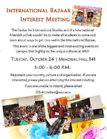 MACOMB, IL – The Western Illinois University Center for International Studies and the International Friendship Club will host an interest meeting about the International Bazaar from 5-6 p.m. Tuesday, Oct. 24 in Memorial Hall 341.