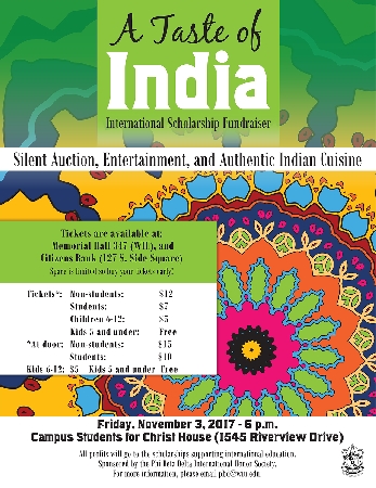 The fundraiser will feature a silent auction, entertainment and authentic Indian cuisine. All proceeds benefit scholarships supporting international education at Western. Two scholarships of $500 each will be awarded; one to a WIU student studying abroad and one to an international student at WIU.