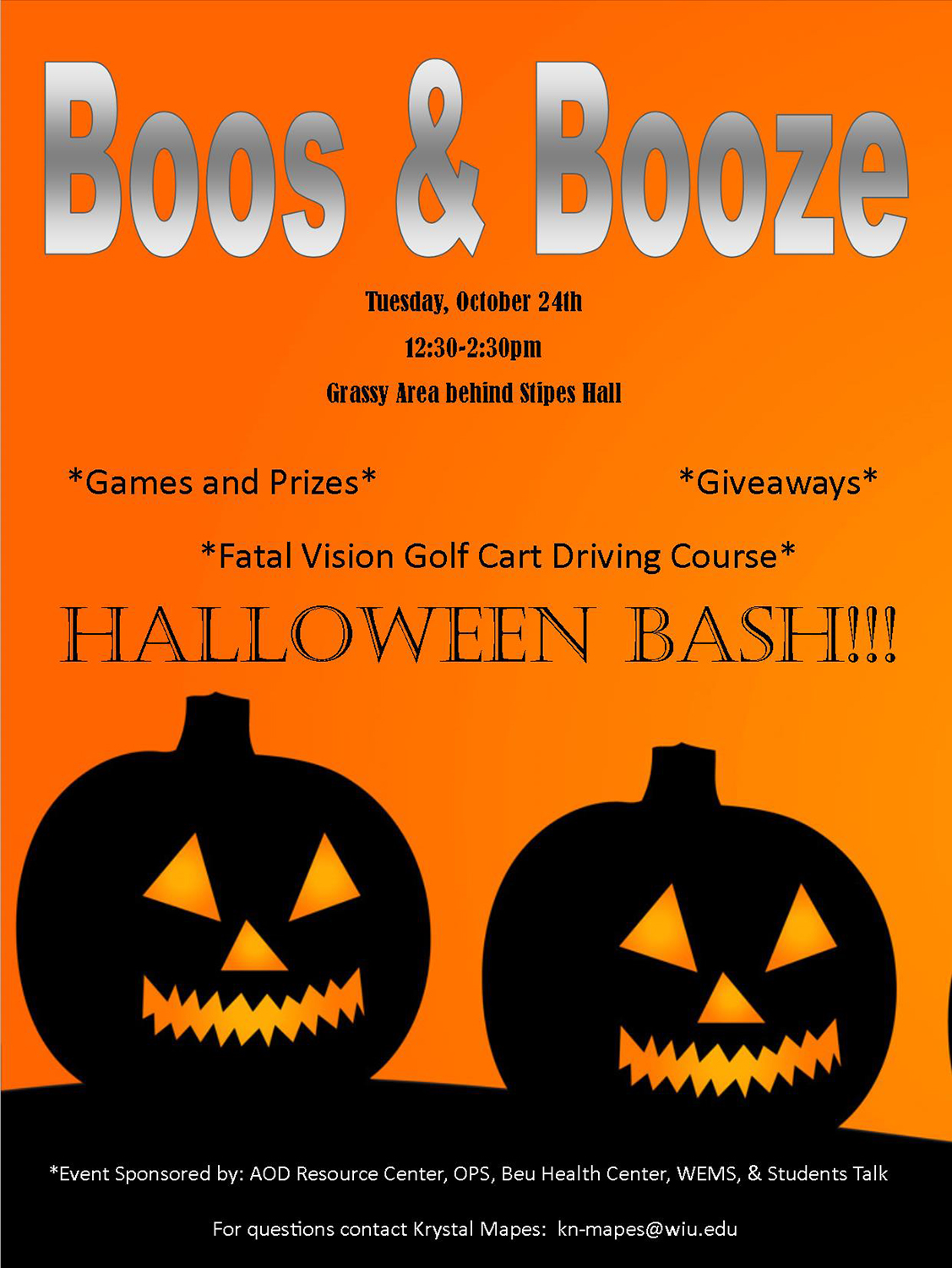 MACOMB, IL – The Alcohol and Other Drugs Resource Center at Western Illinois University will host Boos and "Booze" from 12:30-2:30 p.m. Tuesday, Oct. 24 in the grassy area behind Stipes Hall.