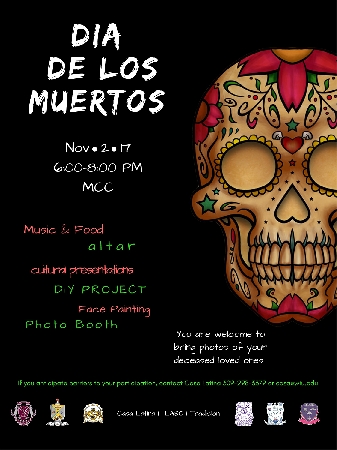 The celebration will include history of how Dia de los Muertos is celebrated, music and food, cultural presentations, face painting and a photo booth. Guests are welcome to bring photographs of their deceased loved ones.