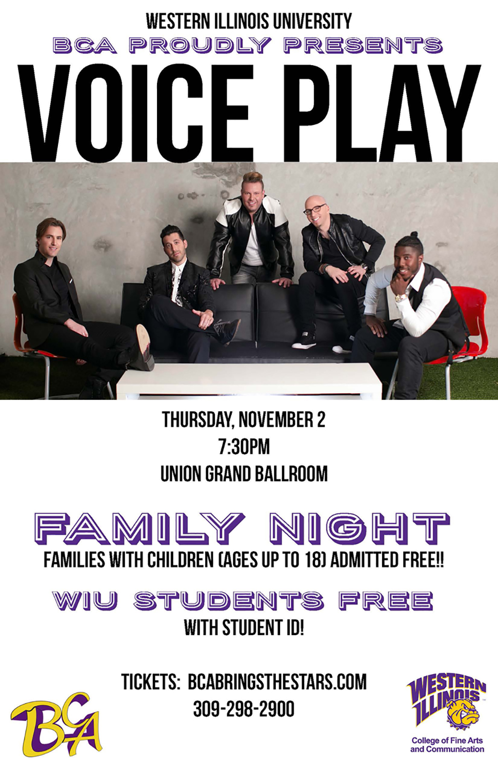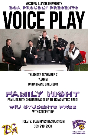 MACOMB, IL – The vocal group VoicePlay will perform at 7:30 p.m. Thursday, Nov. 2 at the Western Illinois University Union Grand Ballroom as part of the annual BCA schedule.