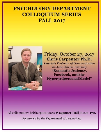 MACOMB, IL – Western Illinois University Associate Professor of Communication Chris Carpenter will deliver "Romantic Jealousy, Facebook, and the Hyper3rdpersonal Model" as part of the Fall 2017 Psychology Department Colloquium Series at 3 p.m. Friday, Oct. 27.