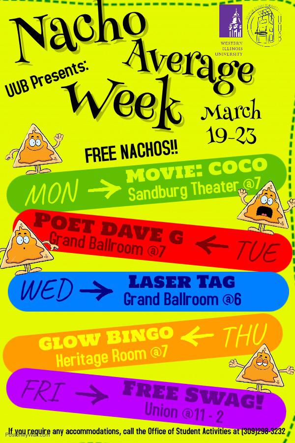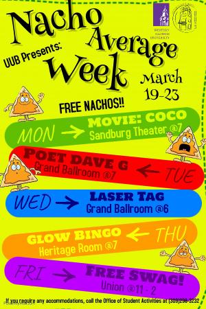MACOMB, IL – The University Union Board (UUB) at Western Illinois University will host its annual Best Week Ever, themed "Nacho Average Week," Monday-Friday, March 19-23, the week after Spring Break.