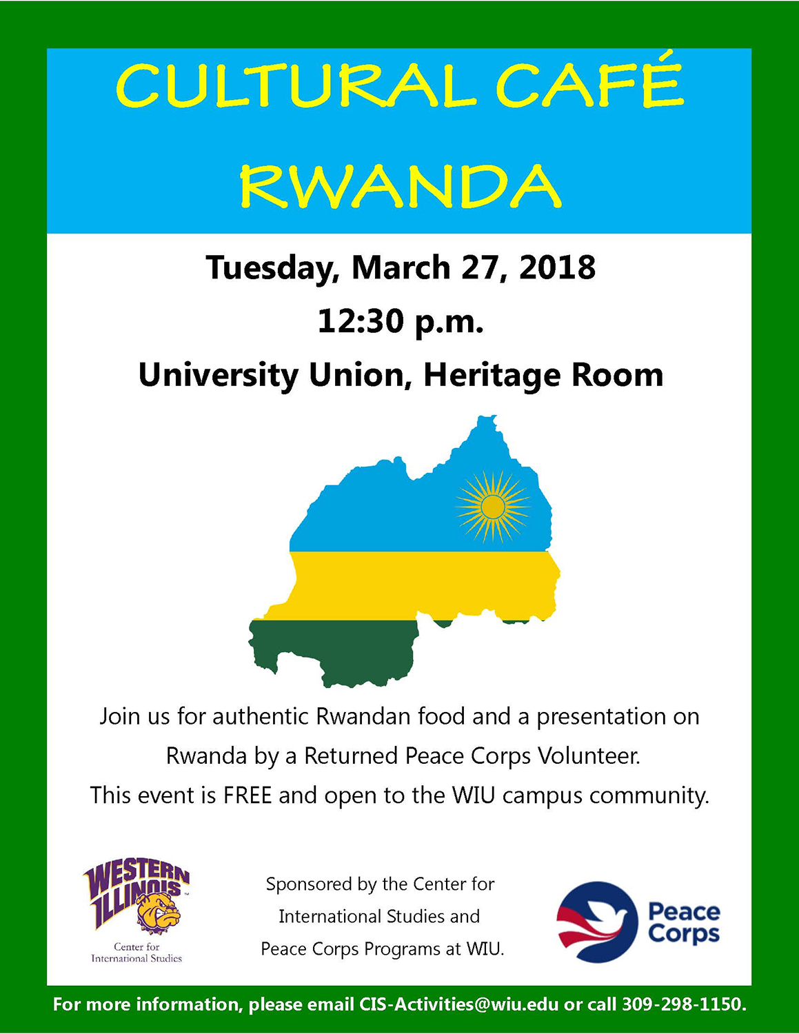 MACOMB, IL -- Western Illinois University's Center for International Studies (CIS) and the Peace Corps program will host the "Cultural Cafe Rwanda" event at 12:30 p.m. Tuesday, March 27, in the University Union Heritage Room.