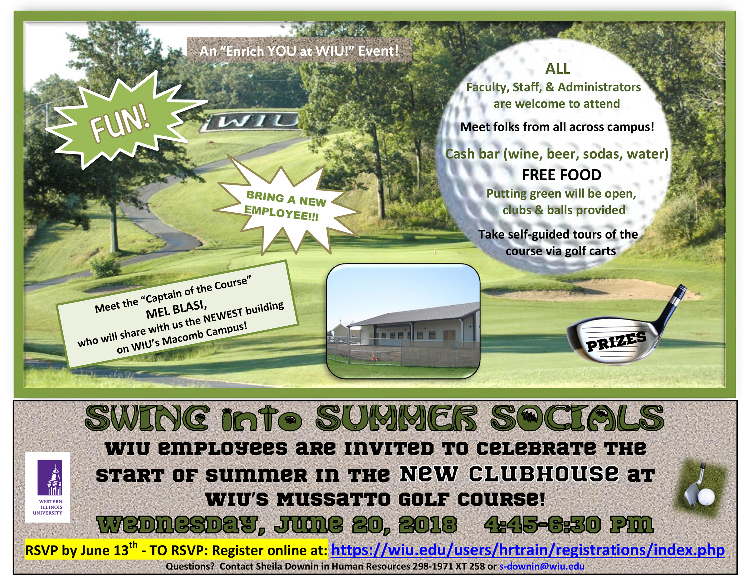 MACOMB, IL - - All Western Illinois University faculty, staff and administrators are invited to "Swing into Summer Socials" with WIU Human Resources Talent Management from 4:45-6:30 p.m. Wednesday, June 20 at the Harry Mussatto Golf Course, 1215 Tower Rd, Macomb.