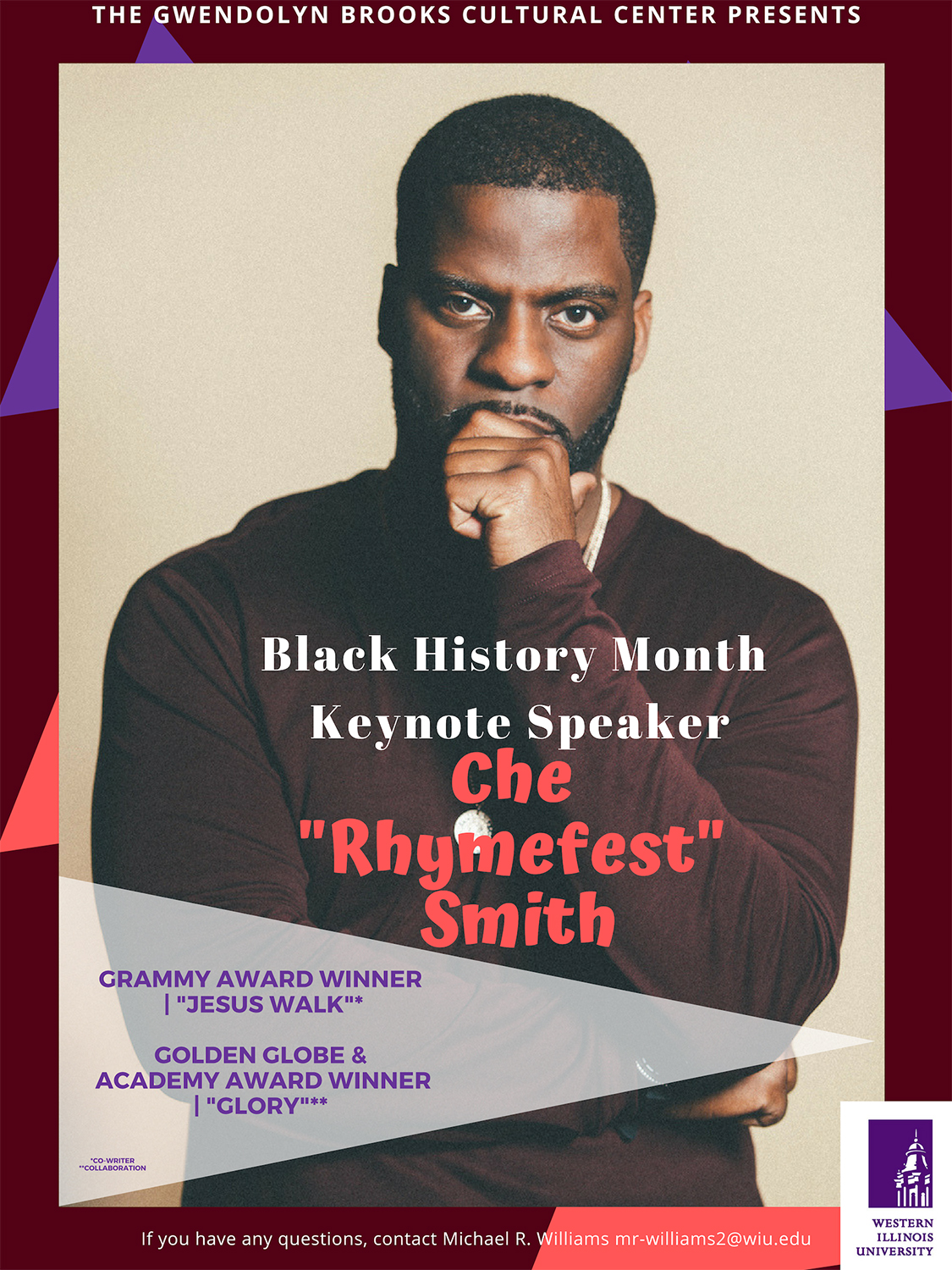The theme for the Black History Month Celebration and the 50th anniversary of The Gwendolyn Brooks Cultural Center is "Our Roots Run Deep." The annual Black History Month keynote event will begin at 6:30 p.m. Monday, Feb. 4, in the University Union Heritage Room. This year's keynote speaker is Chicago native, Che "Rhymefest" Smith.