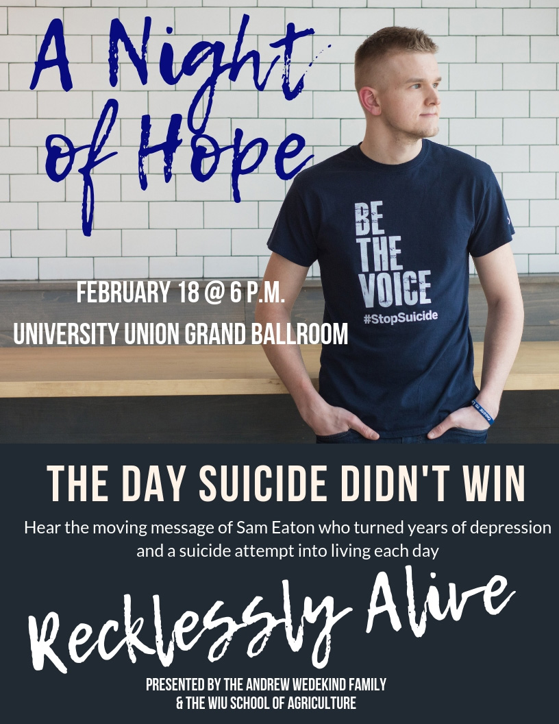 The event, featuring speaker Sam Eaton, is presented by the Andrew Wedekind family and the WIU School of Agriculture. Eaton is a writer, speaker and founder of Recklessly Alive Ministries who will share his story of surviving a suicide attempt.