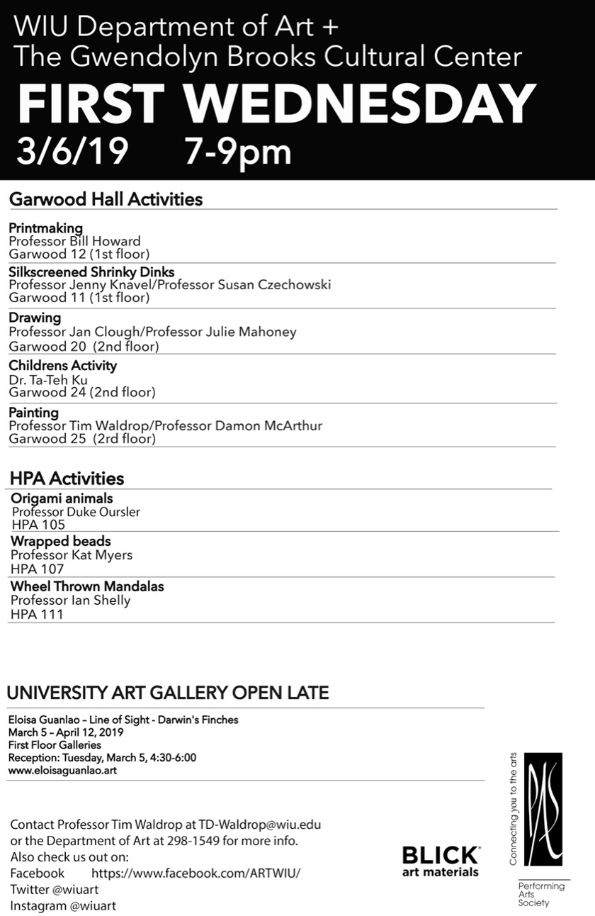 MACOMB,IL – The Western Illinois University Department of Art announces "First Wednesday" to be held from 7-9 p.m., Wednesday, March 6 in Garwood Hall, the Heating Plant Annex (HPA) and the University Art Gallery.