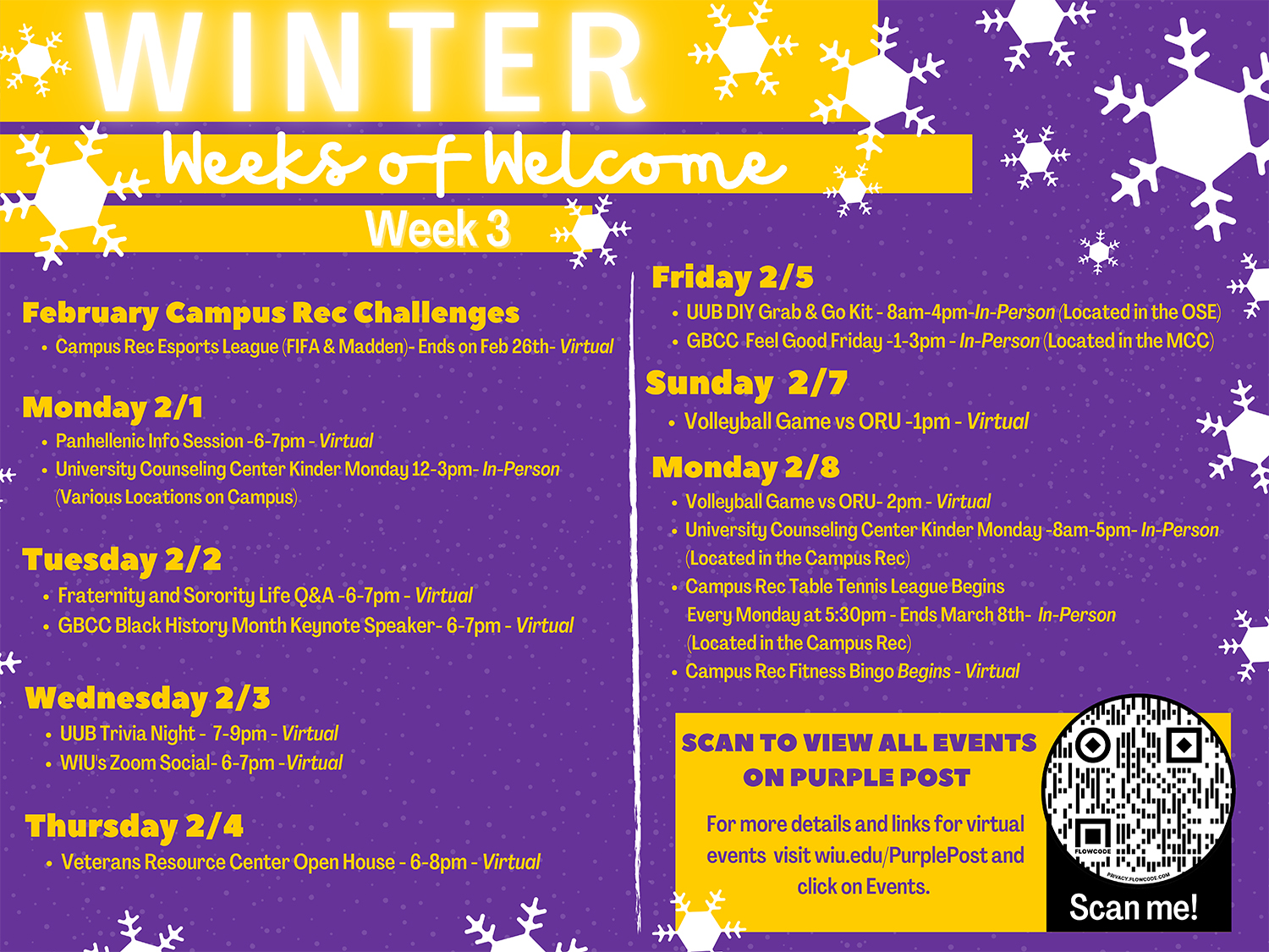 More details about each event can be found at wiu.edu/purplepost and by clicking on "events," or by downloading the CORQ mobile app and logging in with an ecom username and password.