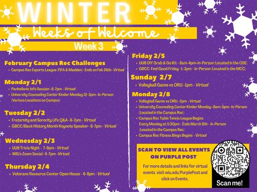 MACOMB, IL – The Western Illinois University Office of Student Engagement (OSE), in conjunction with numerous other campus offices, will host "Winter Weeks of Welcome" for the first four weeks of the Spring 2021 semester.