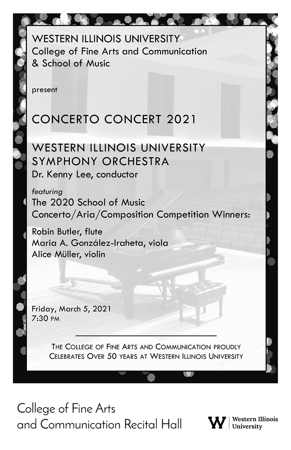 MACOMB, IL -- The Western Illinois University School of Music will present its annual Concerto/Aria/Composition Competition Concert at 7:30 p.m. Friday, March 5 in the College of Fine Arts and Communication (COFAC) Recital Hall. The student winners of the 2020 competition will perform with the WIU Symphony Orchestra, conducted by WIU Symphony Orchestra Conductor Kenny Lee.