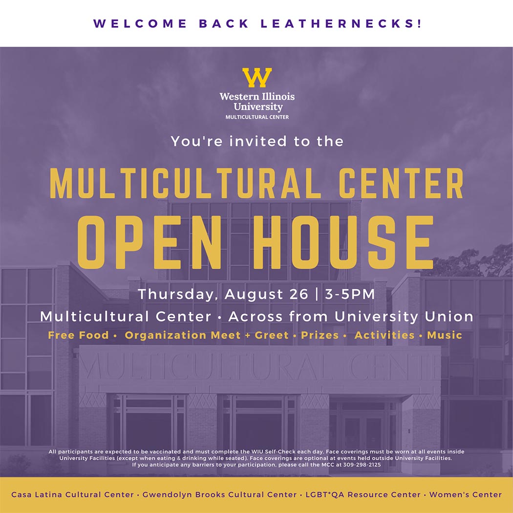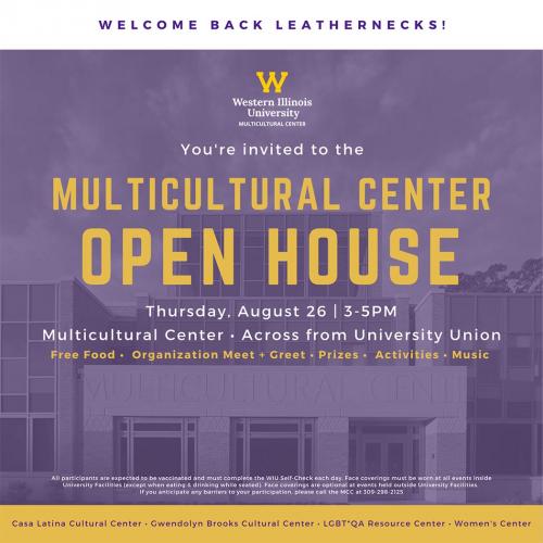 MACOMB, IL – Members of the Western Illinois University and local communities are invited to attend the WIU Multicultural Center Open House on the MCC lawn (west of the center, along Murray Street/CT Vivian Way) from 3-5 p.m. Thursday, Aug. 26.