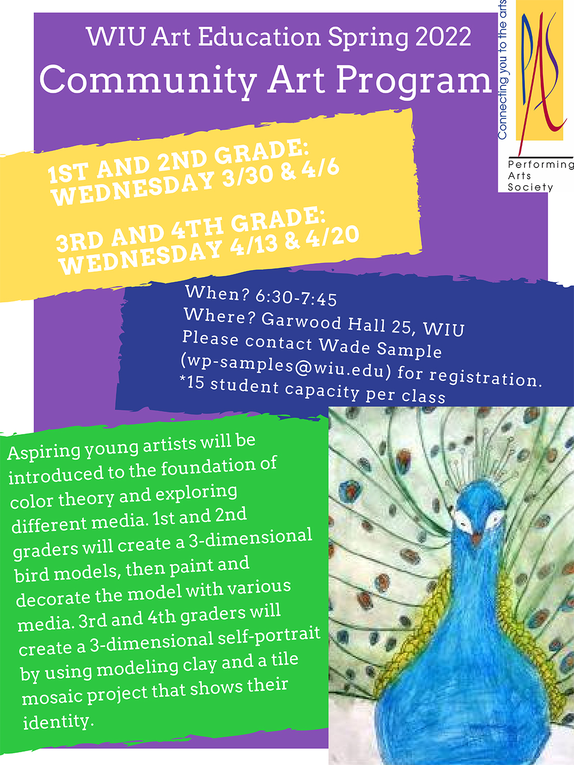 MACOMB, IL – The schedule for the free Western Illinois University Art Education Spring 2022 Community Art Program has been released for students in grades 1-2 and 3-4.