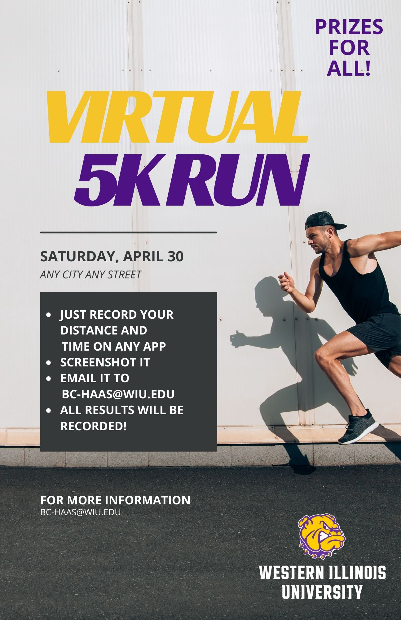 To participate in the event, participants can record distance and time on any app, screenshot the run and email it to bc-haas@wiu.edu. All results will be recorded and prizes will be provided to every participant.