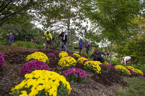 On Tuesday, volunteers will mulch the Q-Lot berm and on Wednesday, plant purple and gold mums, and complete mulching, at the Alumni House and Alumni Plaza. All tools and materials will be provided, along with refreshments.