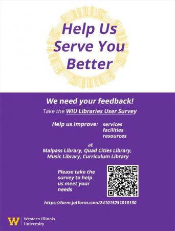 The survey will take five to 10 minutes to complete and give the WIU Libraries valuable information to improve the services, facilities and resources for our whole community at any of the four locations: Malpass Library, the Quad Cities Library, the Music Library and the Curriculum Library. This survey is intended for library users and non-library users.