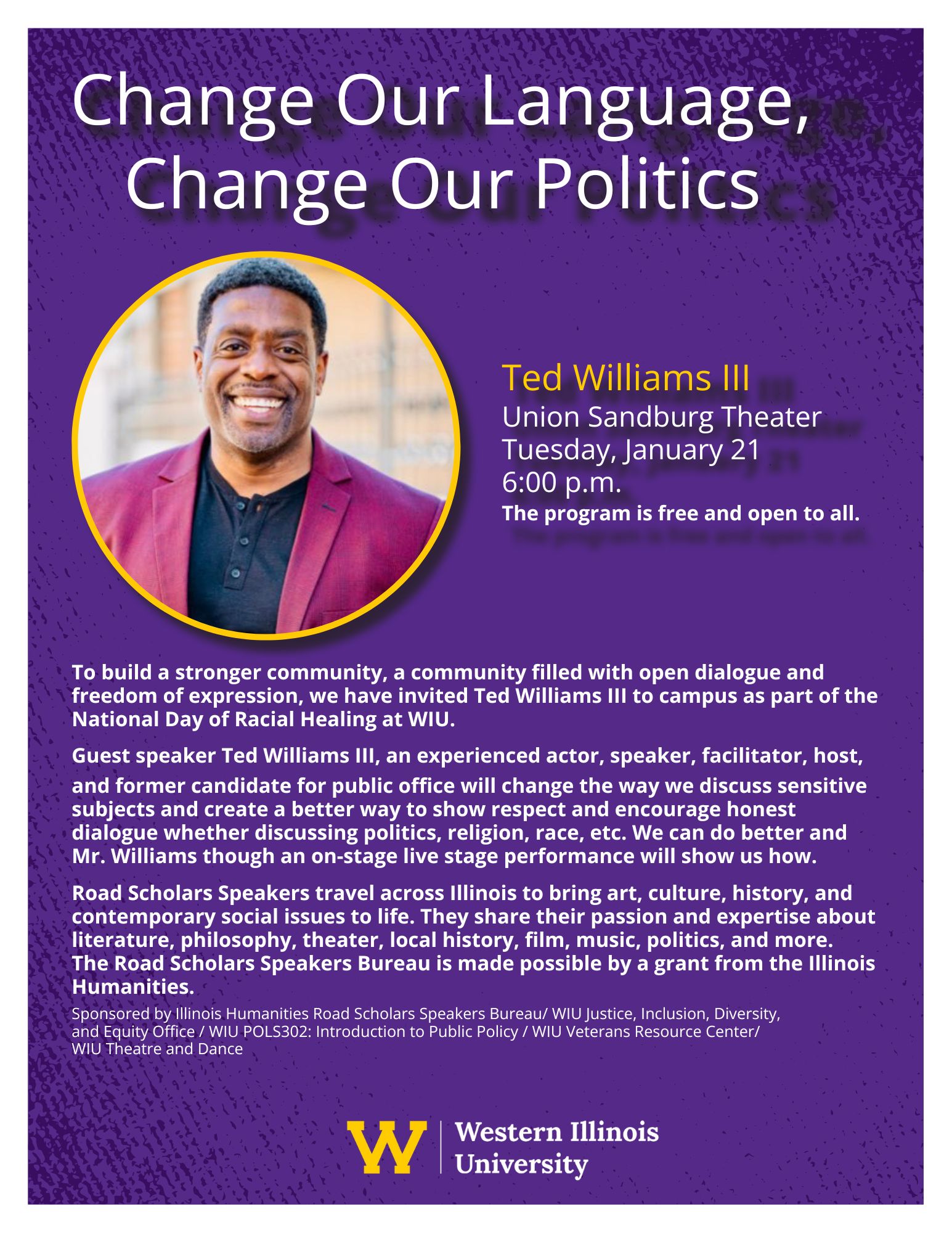 This event is part of WIU's participation in the National Day of Racial Healing (NDORH) which takes place on the Tuesday following Martin Luther King, Jr. Day. The NDORH is meant to raise awareness of the need for societal healing through activities that happen in homes, schools, businesses and communities across the country with the goal of creating a more just and equitable future for our children. Mr. Williams' presentation is a key part of this year's celebration and is co-presented by the Illinois Humanities Road Scholars Speakers Bureau. Road Scholar speakers travel throughout Illinois sharing free, dynamic presentations about literature, philosophy, theater, local history, film, music, politics, and more, at no cost to host organizations. The program enables local nonprofit organizations to present free-admission cultural programs to their communities.