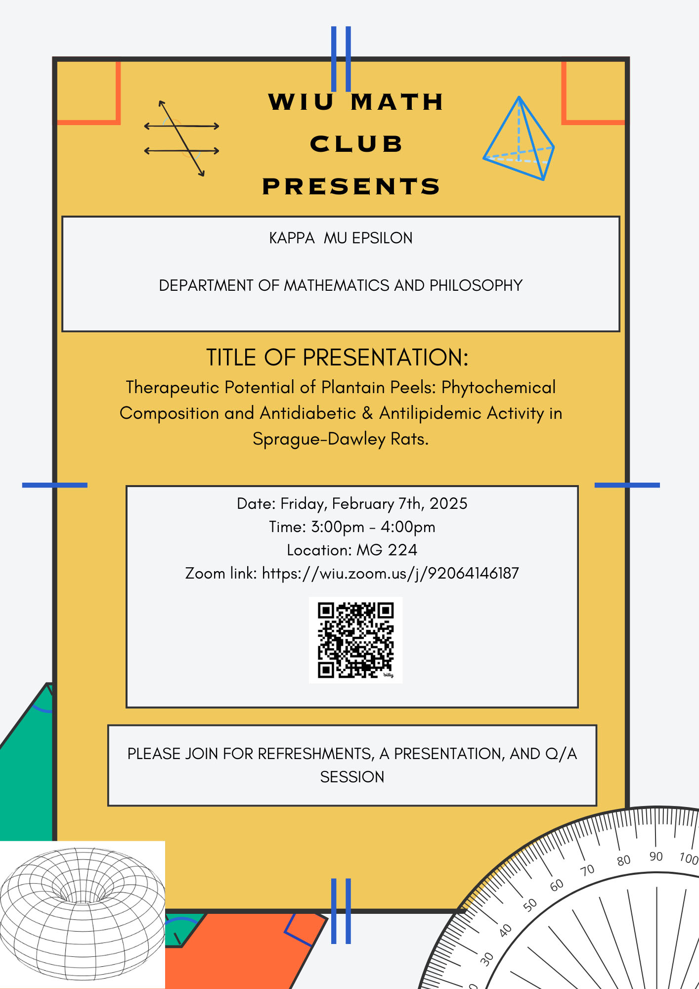 Latiff will present, "Therapeutic Potential of Plantain Peels: Phytochemical Composition and Antidiabetic & Antilipidemic Activity in Sprague-Dawley Rats." Following the presentation, there will be a question and answer session.