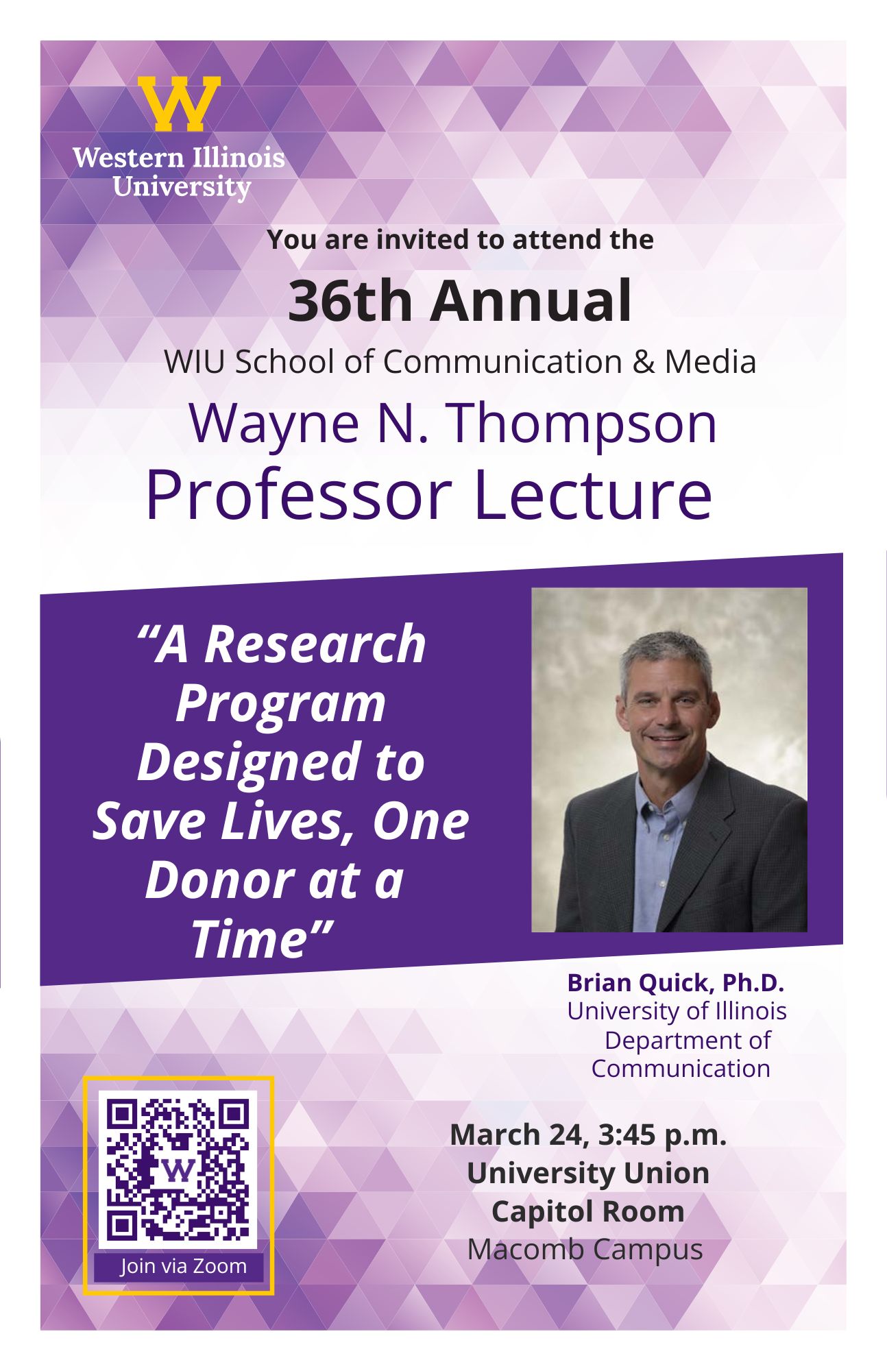 MACOMB/MOLINE, IL - - The Western Illinois University School of Communication & Media will host the annual Wayne Thompson Lecture on Monday, March 24, featuring University of Illinois professor Brian Quick. The event, titled "A Research Program Designed to Save Lives, One Donor at a Time," will occur from 3:45-5 p.m. in the Capitol Room of the WIU University Union.