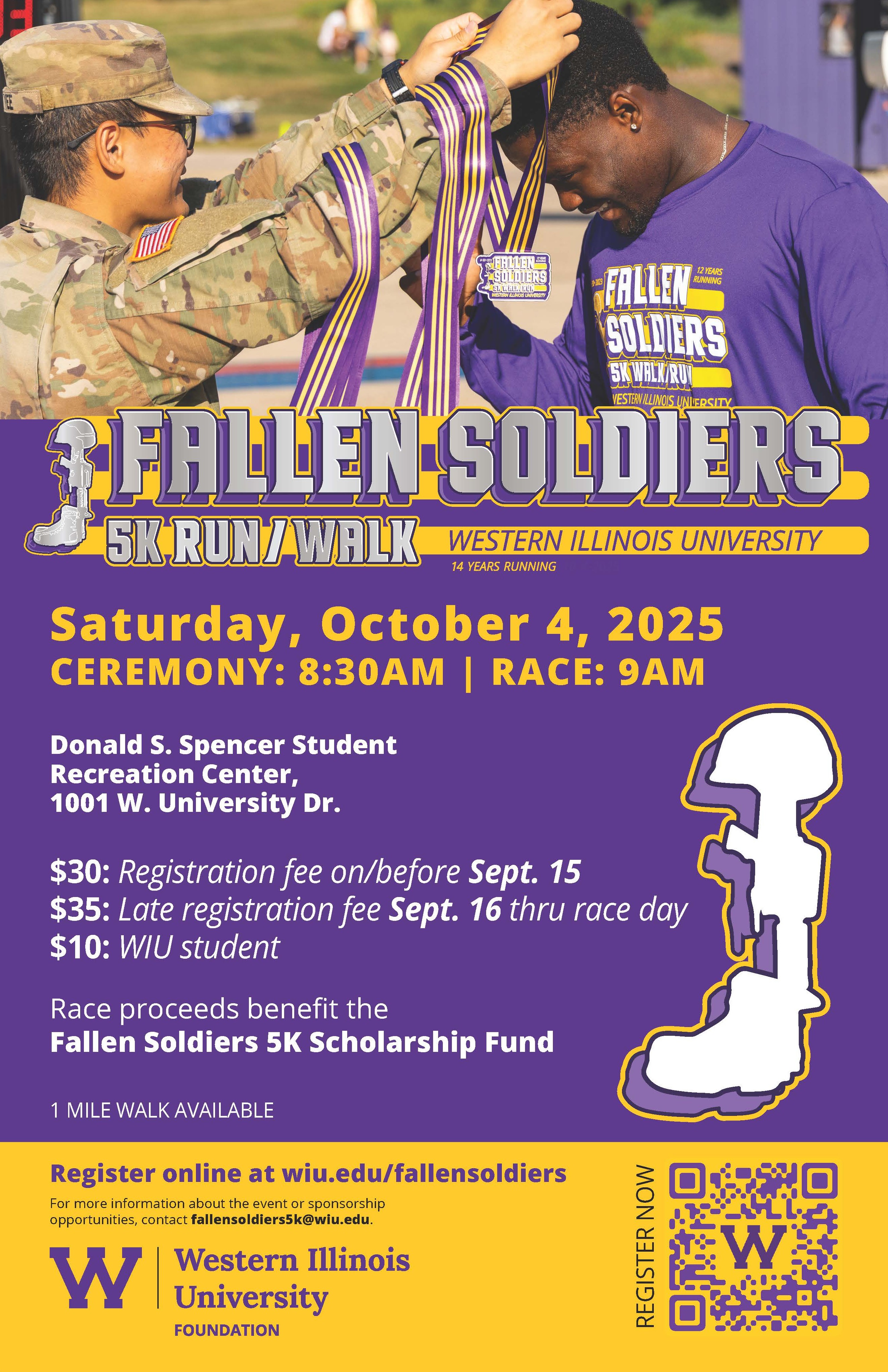 For more event information, to register, or to become an event sponsor, visit wiu.edu/fallensoldiers or email fallensoldiers5k@wiu.edu.