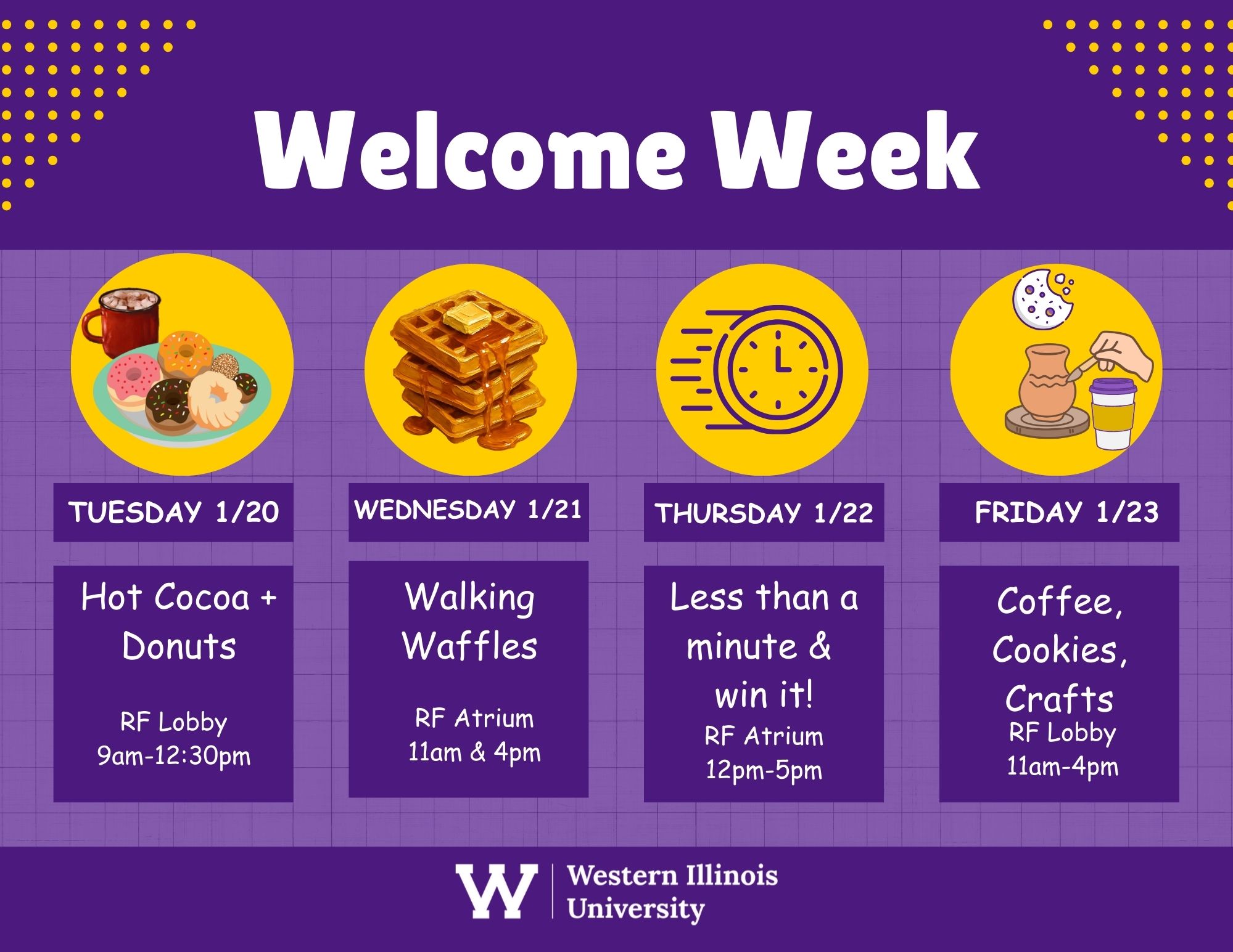 MOLINE, IL – Western Illinois University-Quad Cities will host Welcome Week 2026, Tuesday, Jan. 20–Friday, Jan. 23. All events are open to WIU students, staff and faculty members.