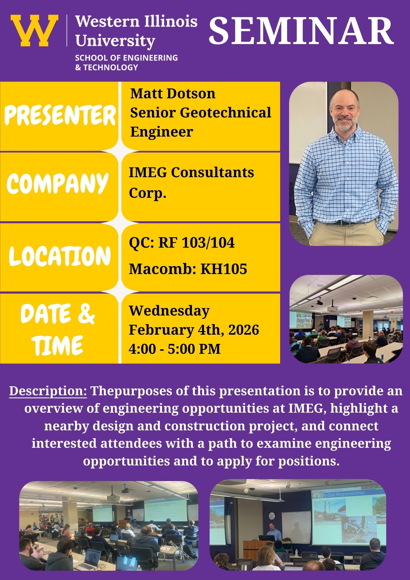 MOLINE, IL- - The Western Illinois University School of Engineering & Technology will host a professional seminar from 4-5 p.m. Wednesday, Feb. 4, featuring Matt Dotson, senior geotechnical engineer with IMEG Consultants Corp.