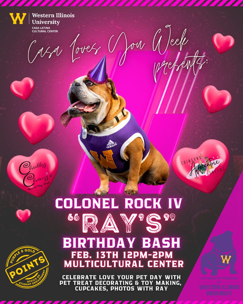 Western Illinois University's live mascot, Colonel Rock IV, aka "Ray," will have a birthday party from noon-2 p.m. Friday, Feb. 13, just ahead of his eighth birthday on Saturday, Feb. 14. The party is being supported by the WIU Live Mascot Program, Casa Latina Cultural Center, Chingonx Afrocentric Queers, Chubby Chewy's Gourmet Dog Treats and the Multicultural Center.