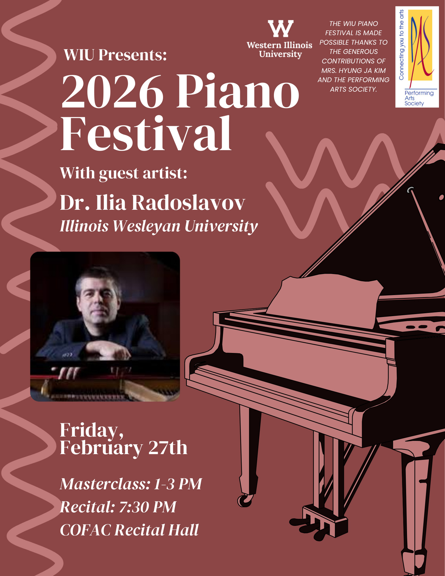 The 2026 WIU Piano Festival is made possible by the generous support of Professor Emerita Hyung Ja Kim and the Performing Arts Society.