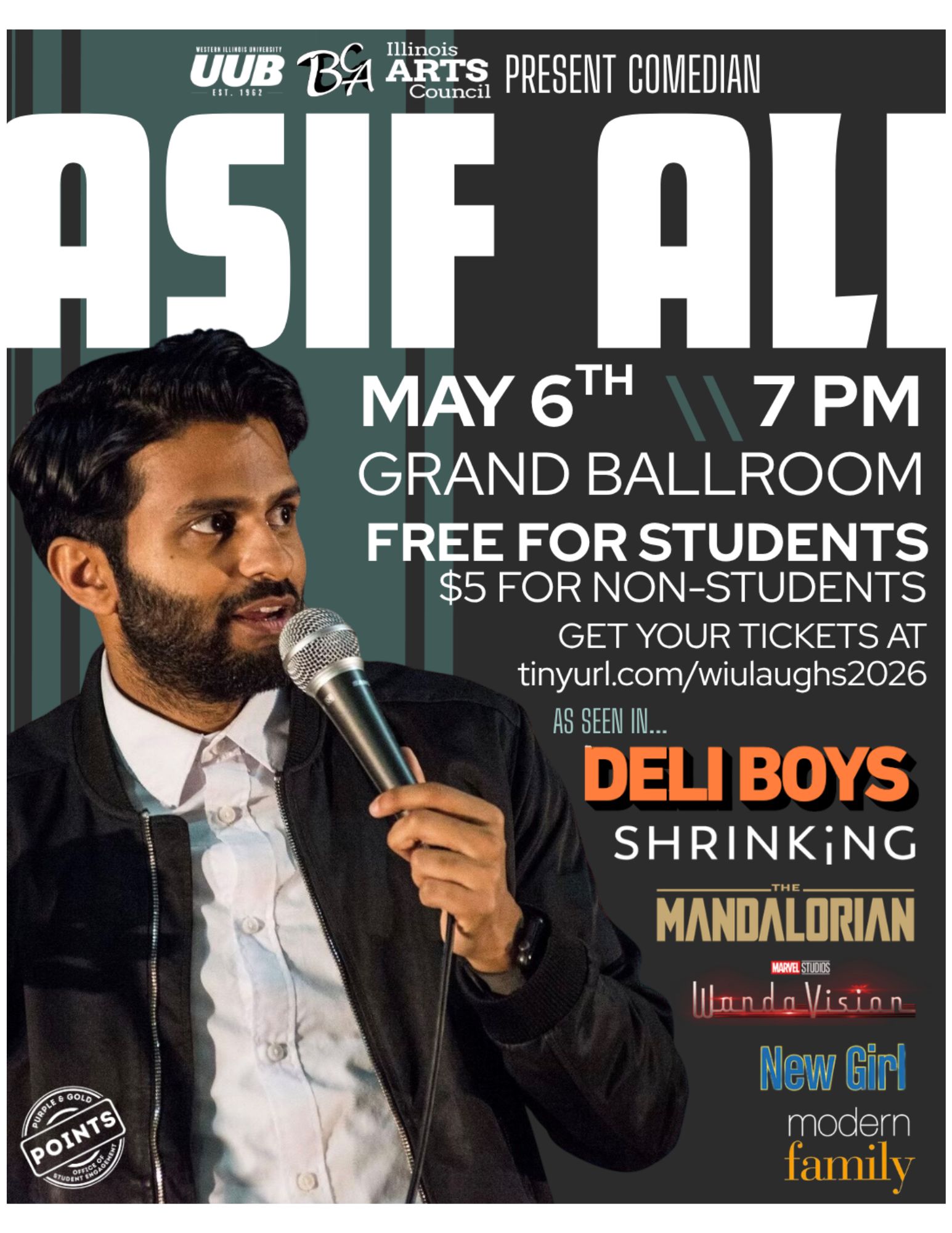 Macomb, IL - - Western Illinois University is set to host an evening of laughter as comedian and actor Asif Ali takes the stage at 7 p.m., Wednesday, May 6, in the University Union Grand Ballroom. Doors will open at 6:30 p.m.