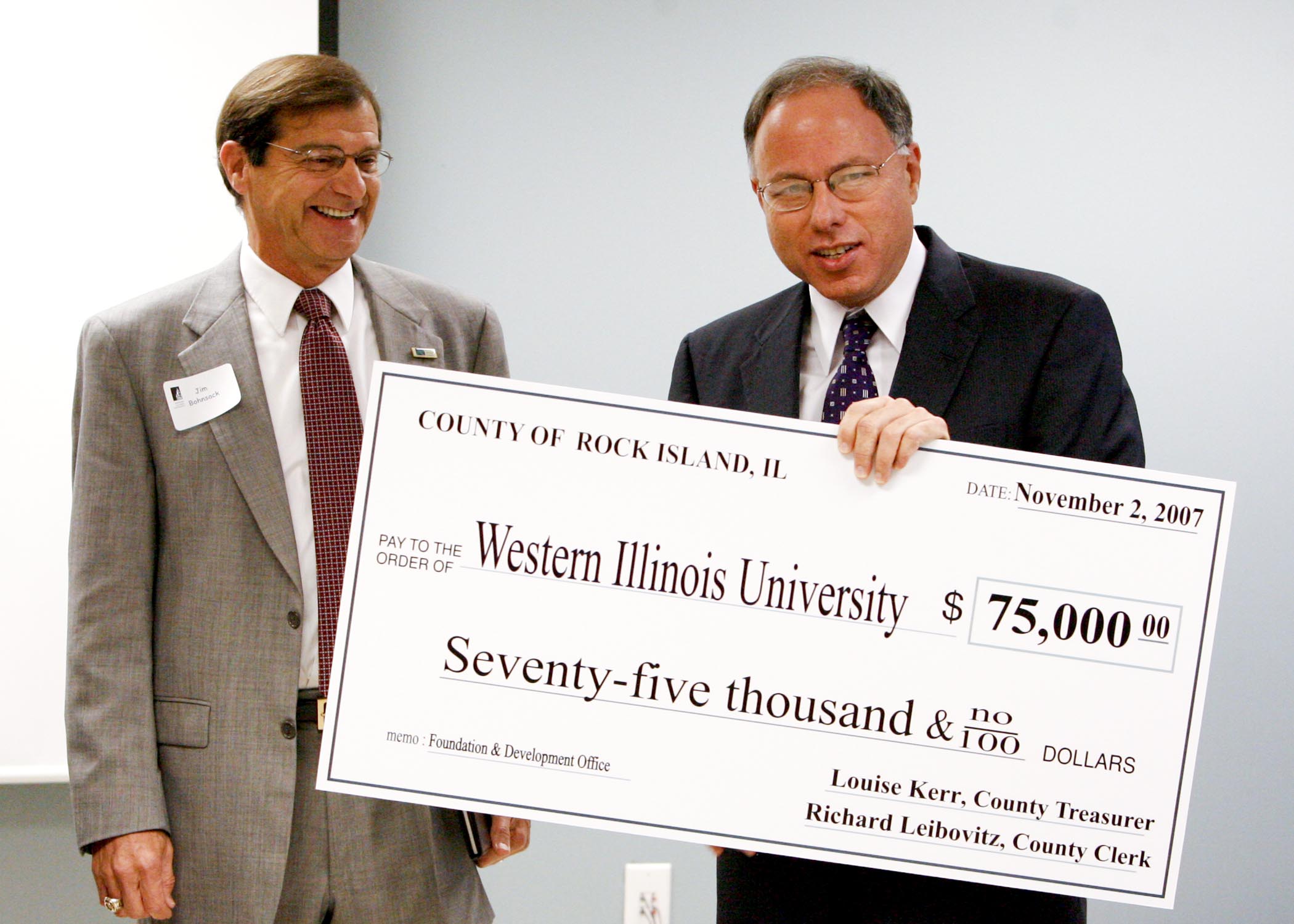 MOLINE, IL -- The Rock Island County Board presented the Western Illinois University-Quad Cities campus with a check for $75,000 for the new Riverfront campus and announced the establishment of two new scholarships for WIU-QC students.