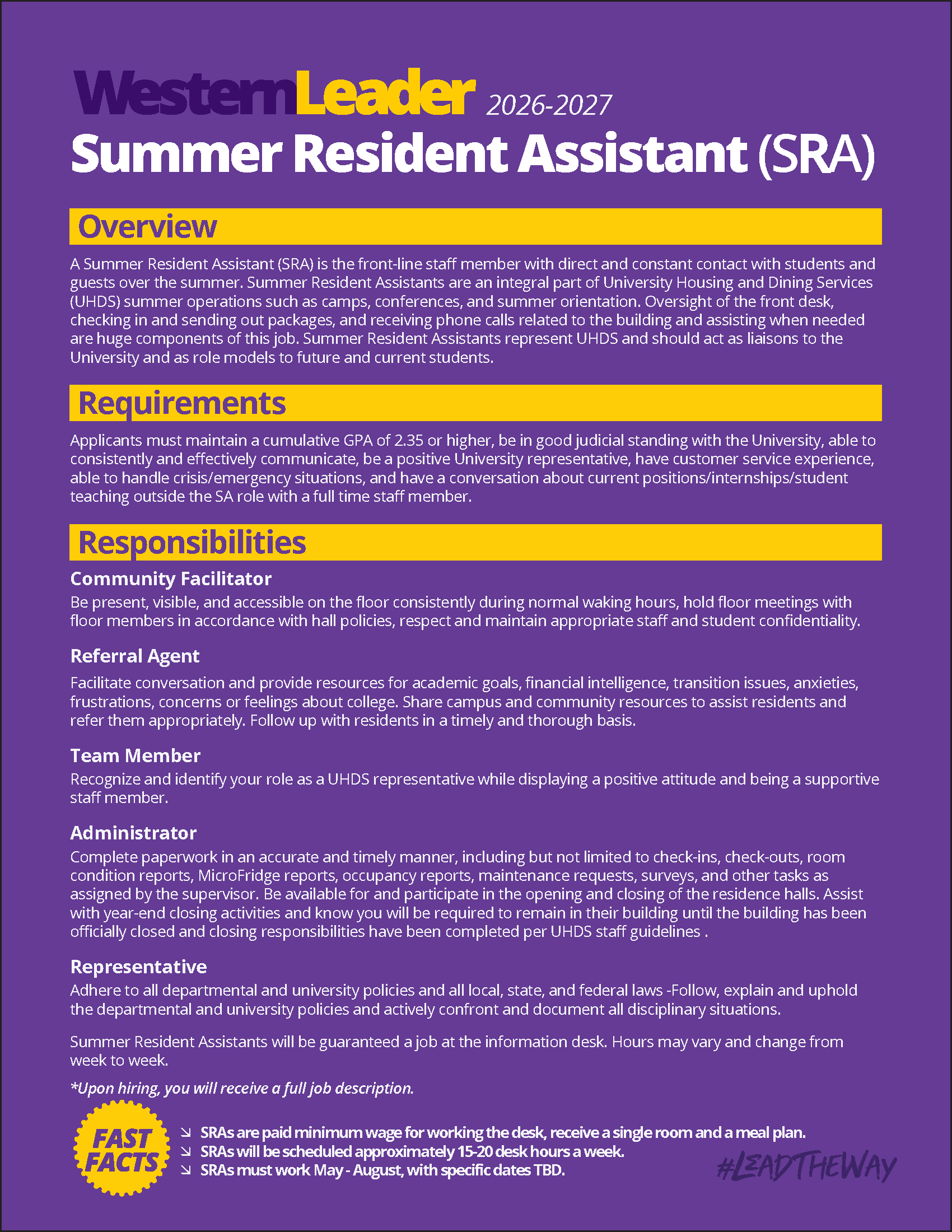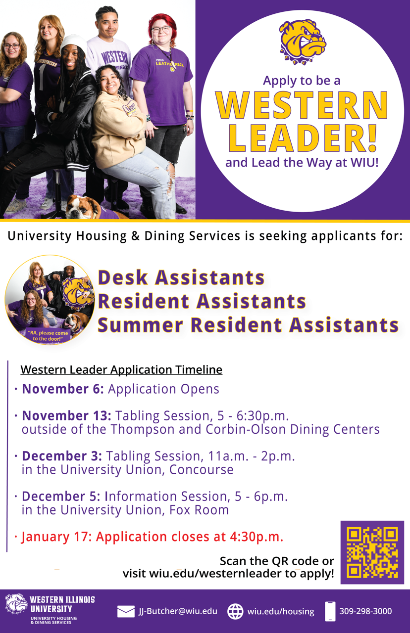 A Western Leader is someone who holds a student leader position on campus through University Housing & Dining Services. The Western Leader Recruitment Process encompasses a variety of undergraduate student leader positions on campus. This year, we are seeking applicants for the Desk Assistant, Resident Assistant, and Summer Resident Assistant positions on campus. You only need one application for all three positions!