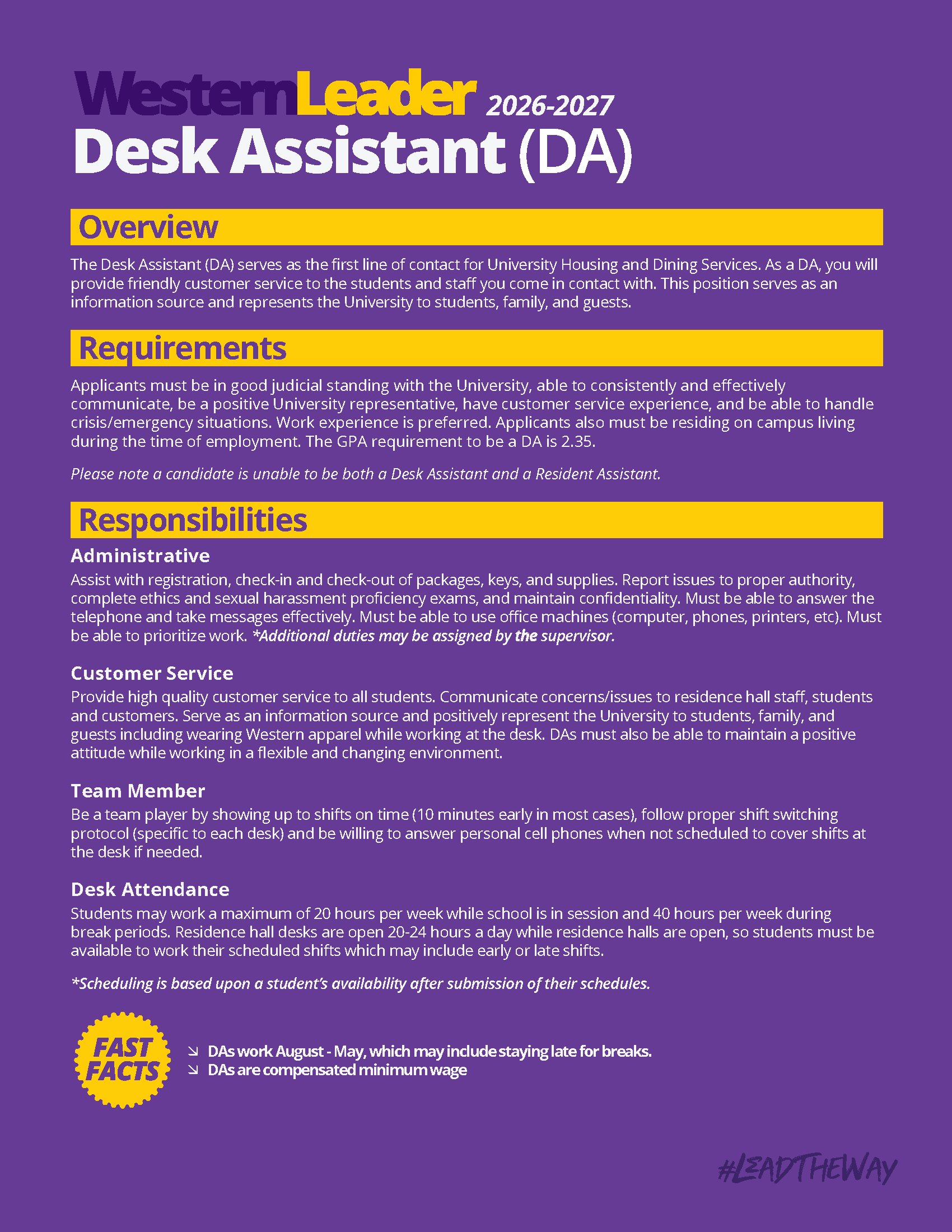 The Desk Assistant (DA) serves as the first line of contact for University Housing and Dining Services. As a DA, you will learn skills such as leadership, friendly customer service to the students and staff you come in contact with, administrative skills, communications, and crisis response. This position serves as an information source and represents the University to students, families, and guests.