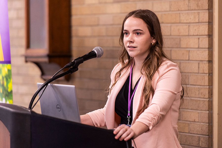 Second Place: Ariana Sanchez of St. Charles, IL, with faculty mentor, Kristine Kelly, Psychology – “Comparing White Fragility Across Three Measures”